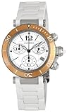Stainless steel case with a white rubber bracelet. 18kt pink gold fixed bezel. Silvered opaline dial with luminous hands and stick hour markers. Arabic numerals mark the 3, 6, 9 and 12 o'clock positions. Minute Markers around the outer rim. Date displays at the 4 o'clock position. Chronograph - three sub-dials displaying: 12 hours, 30 minutes, 60 seconds. Quartz movement. Scratch resistant sapphire crystal. Screw down crown. Solid case back. Case diameter: 37 mm. Case thickness: 12.1 mm. Double adjustable deployment clasp. Water resistant at 100 meters / 330 feet. Functions: hours, minutes, seconds, date, chronograph. Cartier Pasha Seatimer Chronograph Ladies Watch W3140004.